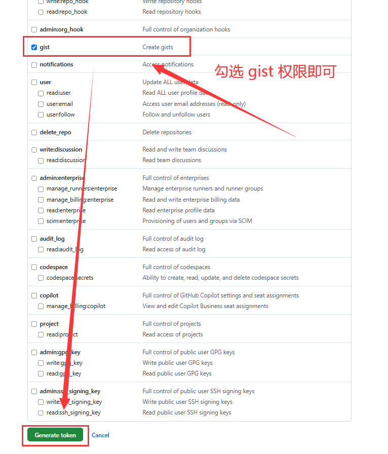2.在生成页面:将 Expiration 设置为 No expiration,勾选 gist 权限,然后点击 Generate token;