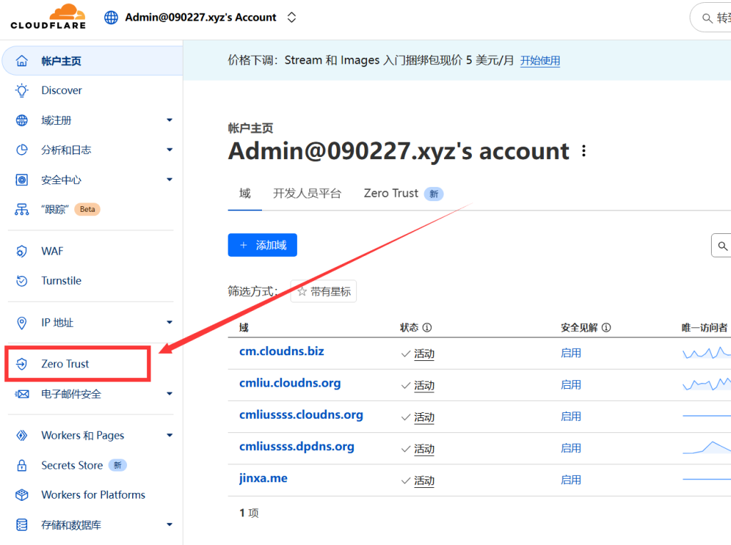 1.登录 Cloudflare,进入 Zero Trust;