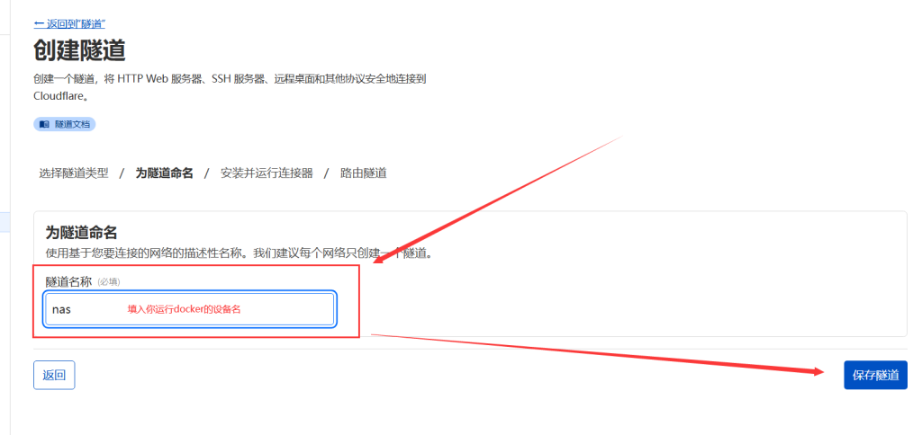 4.为隧道命名,填入你运行docker设备的名称(如:nas),点击 保存隧道;