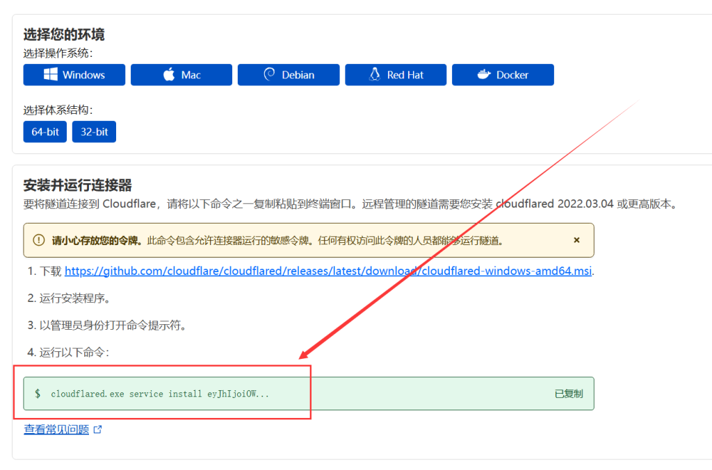 其中cloudflared.exe service install之后的内容就是我们需要的 隧道TOKEN,请务必记录下来。